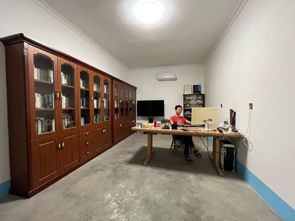 父母為書房白墻,本人幸運再購一組同款五門書櫃,長桌於中,茶具、臺燈、電腦、電視依次置辦,墻飾《殘荷新柳》與《Zima Blue》掛畫。